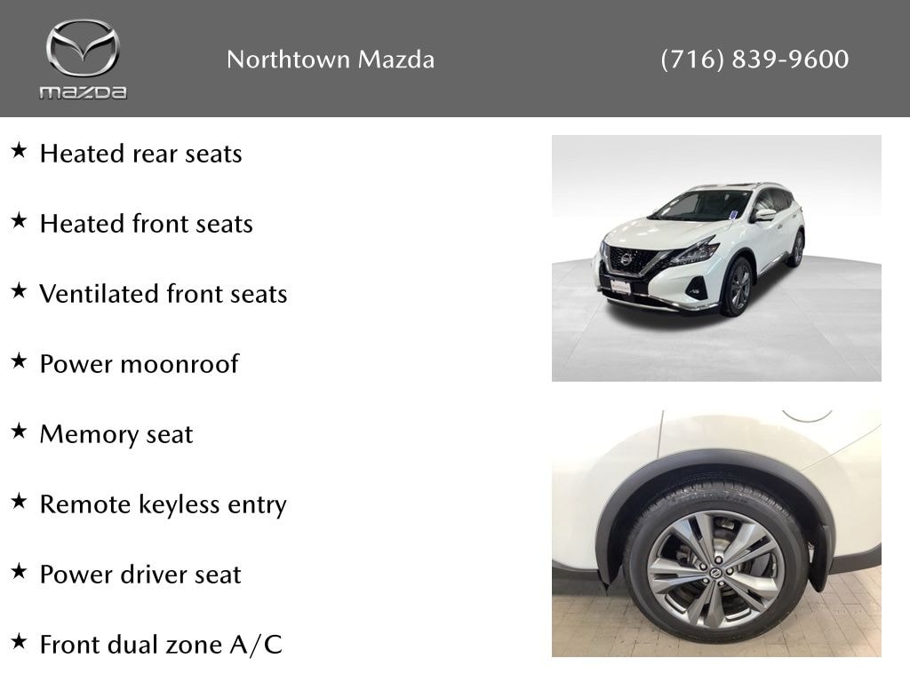 See the rest of our inventory at: NORTHTOWN MAZDA.COM ABS brakes, Active Cruise Control, Alloy wheels, Compass, Electronic Stability Control, Front dual zone A/C, Heated door mirrors, Heated front seats, Heated rear seats, Heated steering wheel, Illuminated entry, Low tire pressure warning, Memory seat, Navigation System, Power driver seat, Power Liftgate, Power moonroof, Remote keyless entry, Traction control, Ventilated front seats, 11 Speakers, 4-Wheel Disc Brakes, 4.667 Axle Ratio, Air Conditioning, AM/FM radio: SiriusXM, AM/FM/CD/MP3/WMA Audio System, Auto High-beam Headlights, Auto tilt-away steering wheel, Auto-dimming Rear-View mirror, Automatic temperature control, Blind Spot Warning, Brake assist, Bumpers: body-color, CD player, Child-Seat-Sensing Airbag, Climate-Controlled Front Bucket Seats, Delay-off headlights, Driver door bin, Driver vanity mirror, Dual front impact airbags, Dual front side impact airbags, Emergency communication system: NissanConnect Services, Four wheel independent suspension, Front anti-roll bar, Front Bucket Seats, Front Center Armrest, Front fog lights, Front reading lights, Fully automatic headlights, Garage door transmitter: HomeLink, Knee airbag, Navigation system: NissanConnect Navigation, NissanConnect featuring Apple CarPlay and Android Auto, NissanConnect Services Powered By SiriusXM, Occupant sensing airbag, Outside temperature display, Overhead airbag, Overhead console, Panic alarm, Passenger door bin, Passenger vanity mirror, Power door mirrors, Power passenger seat, Power steering, Power windows, Radio data system, Rear anti-roll bar, Rear reading lights, Rear seat center armrest, Rear side impact airbag, Rear window defroster, Rear window wiper, Roof rack: rails only, Security system, Semi-Aniline Leather-Appointed Seat Trim, Speed control, Speed-sensing steering, Speed-Sensitive Wipers, Split folding rear seat, Spoiler, Steering wheel memory, Steering wheel mounted audio controls, Tachometer, Telescoping steering wheel, Tilt steering wheel, Trip computer, Turn signal indicator mirrors, Variably intermittent wipers, and Wheels: 20" Dark Hyper Silver.